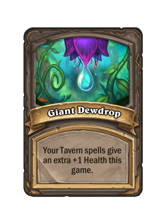 Giant Dewdrop is a Spell in Hearthstone Battlegrounds. Effect: Your Tavern spells give an extra +1 Health this game. Created by: Intrepid Botanist.