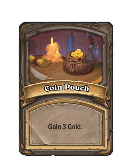Coin Pouch is a Spell in Hearthstone Battlegrounds. Effect: Gain 3 Gold. Created by: Maw Caster Portrait. This card is no longer in the pool (Legacy).