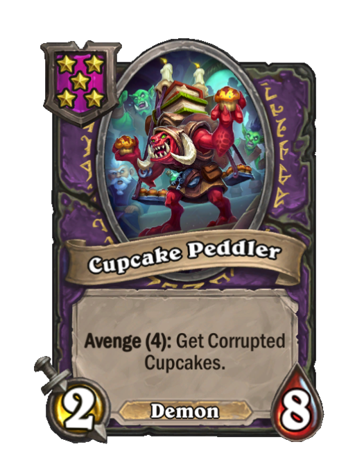Cupcake Peddler is a Tier 5 Demon Minion in Hearthstone Battlegrounds with 2/8 stats featuring Avenge. Effect: Avenge (4): Get Corrupted Cupcakes. This card is no longer in the pool (Legacy).