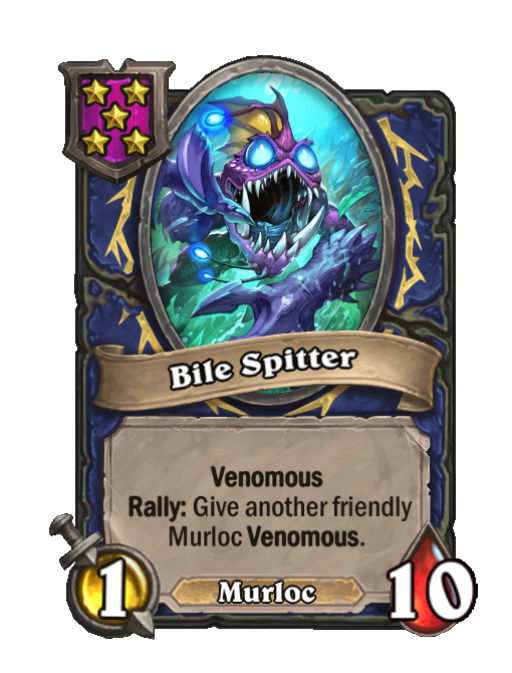 Bile Spitter is a Tier 5 Murloc Minion in Hearthstone Battlegrounds with 1/10 stats featuring Venomous, Rally. Effect: Venomous Rally: Give another friendly Murloc Venomous.