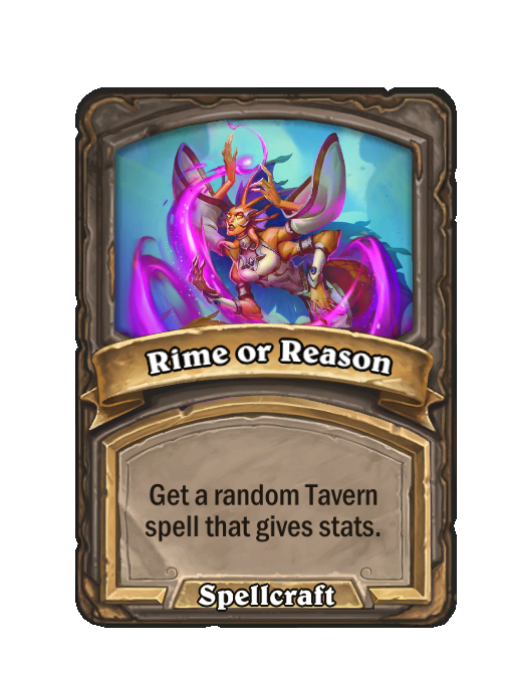 Rime or Reason is a Spell in Hearthstone Battlegrounds (Spellcraft). Effect: Get a random Tavern spell that gives stats. Created by: Rimescale Priestess. This card is no longer in the pool (Legacy).