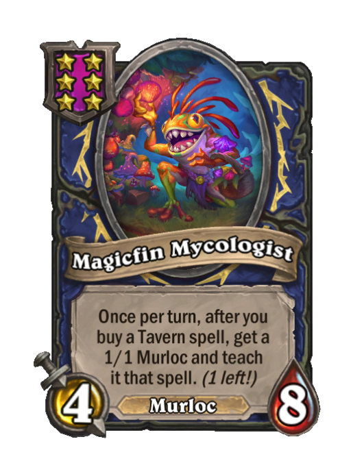 Magicfin Mycologist is a Tier 6 Murloc Minion in Hearthstone Battlegrounds with 4/8 stats. Effect: Once per turn, after you buy a Tavern spell, get a 1/1 Murloc and teach it that spell. (1 left!).