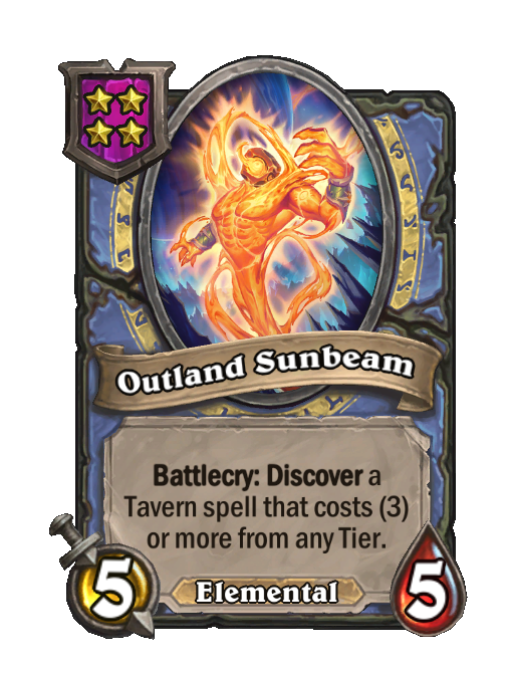 Outland Sunbeam is a Tier 4 Elemental Minion in Hearthstone Battlegrounds with 5/5 stats featuring Battlecry, Discover. Effect: Battlecry: Discover a Tavern spell that costs (3) or more from any Tier. Created by: Farseer Nobundo.