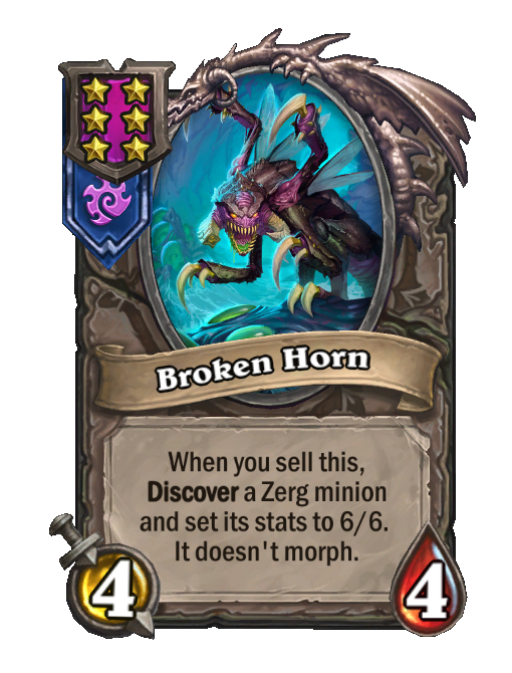 Broken Horn is a Tier 6 Minion in Hearthstone Battlegrounds with 4/4 stats featuring Discover. Effect: When you sell this, Discover a Zerg minion and set its stats to 6/6. It doesn't morph. Created by: Kerrigan, Queen of Blades.