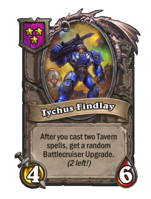 Tychus Findlay is a Tier 3 Minion in Hearthstone Battlegrounds with 4/6 stats. Effect: After you cast two Tavern spells, get a random Battlecruiser Upgrade. (2 left!). Created by: Jim Raynor.