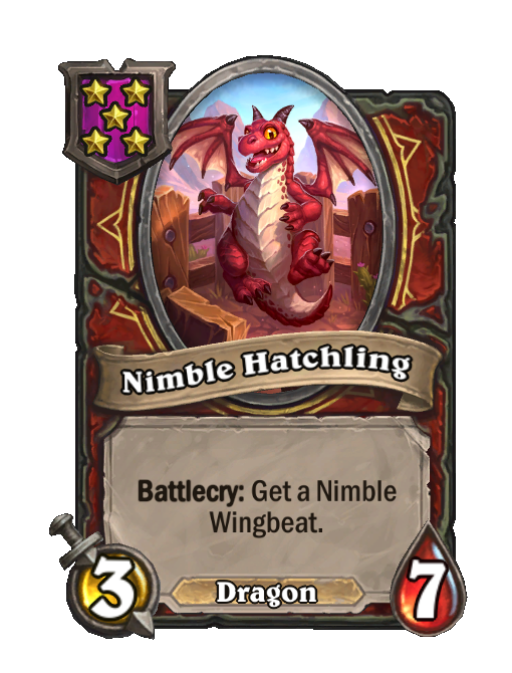 Nimble Hatchling is a Tier 5 Dragon Minion in Hearthstone Battlegrounds with 3/7 stats featuring Battlecry. Effect: Battlecry: Get a Nimble Wingbeat. This card is no longer in the pool (Legacy).