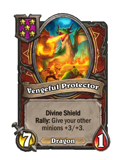 Vengeful Protector is a Tier 5 Dragon Minion in Hearthstone Battlegrounds with 7/1 stats featuring Divine Shield, Rally. Effect: Divine Shield Rally: Give your other minions +3/+3. This card is no longer in the pool (Legacy).