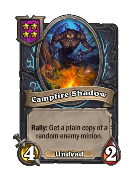 Campfire Shadow is a Tier 4 Undead Minion in Hearthstone Battlegrounds with 4/2 stats featuring Rally. Effect: Rally: Get a plain copy of a random enemy minion. This card is no longer in the pool (Legacy).