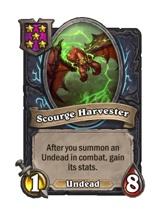 Scourge Harvester is a Tier 5 Undead Minion in Hearthstone Battlegrounds with 1/8 stats. Effect: After you summon an Undead in combat, gain its stats. This card is no longer in the pool (Legacy).