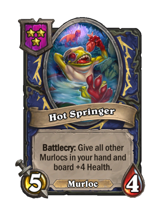 Hot Springer is a Tier 3 Murloc Minion in Hearthstone Battlegrounds with 5/4 stats featuring Battlecry. Effect: Battlecry: Give all other Murlocs in your hand and board +4 Health. This card is no longer in the pool (Legacy).