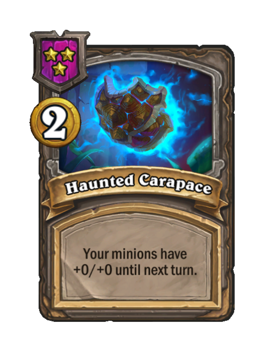 Haunted Carapace is a Tier 3 Spell in Hearthstone Battlegrounds (Tavern). Effect: Your minions have +0/+0 until next turn. Costs 2 Gold. Created by: Haunted Carapace. This card is no longer in the pool (Legacy).