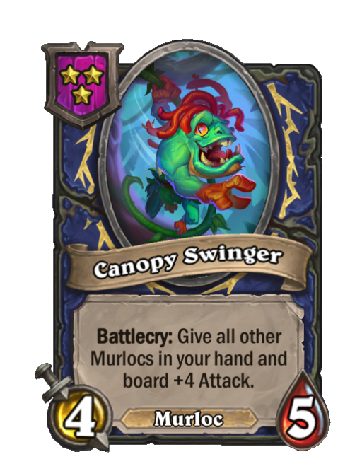 Canopy Swinger is a Tier 3 Murloc Minion in Hearthstone Battlegrounds with 4/5 stats featuring Battlecry. Effect: Battlecry: Give all other Murlocs in your hand and board +4 Attack. This card is no longer in the pool (Legacy).