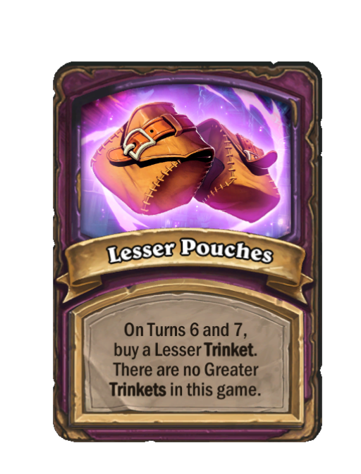Lesser Pouches is a Anomaly in Hearthstone Battlegrounds. Effect: On Turns 6 and 7, buy a Lesser Trinket. There are no Greater Trinkets in this game. This card is no longer in the pool (Legacy).