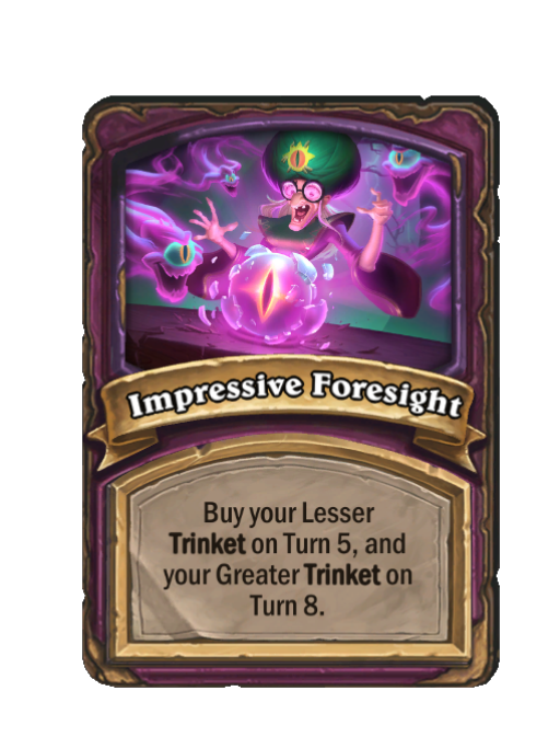 Impressive Foresight is a Anomaly in Hearthstone Battlegrounds. Effect: Buy your Lesser Trinket on Turn 5, and your Greater Trinket on Turn 8. This card is no longer in the pool (Legacy).