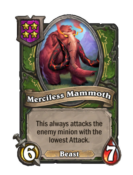 Merciless Mammoth is a Tier 4 Beast Minion in Hearthstone Battlegrounds with 6/7 stats. Effect: This always attacks the enemy minion with the lowest Attack. This card is no longer in the pool (Legacy).