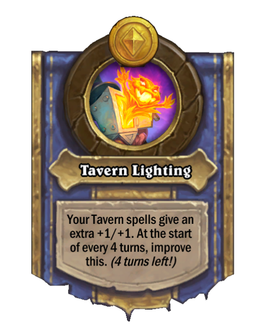 Tavern Lighting is a Hero Power in Hearthstone Battlegrounds featuring Aura. Effect: Your Tavern spells give an extra +1/+1. At the start of every 4 turns, improve this. (4 turns left!). Created by: Rakanishu.