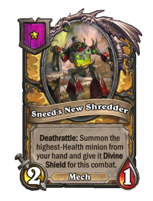 Sneed's New Shredder is a Tier 1 Mech Minion in Hearthstone Battlegrounds with 2/1 stats featuring Deathrattle. Effect: Deathrattle: Summon the highest-Health minion from your hand and give it Divine ____Shield for this combat.__. Created by: Pilot the Shredder.