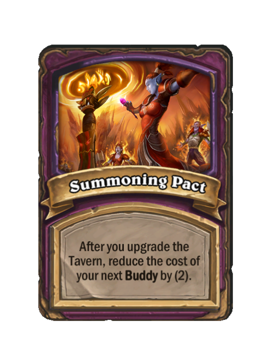 Summoning Pact is a Anomaly in Hearthstone Battlegrounds. Effect: After you upgrade the Tavern, reduce the cost of your next Buddy by (2). This card is no longer in the pool (Legacy).