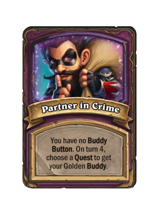 Partner in Crime is a Anomaly in Hearthstone Battlegrounds. Effect: You have no Buddy Button. On turn 4, choose a Quest to get your Golden Buddy. This card is no longer in the pool (Legacy).