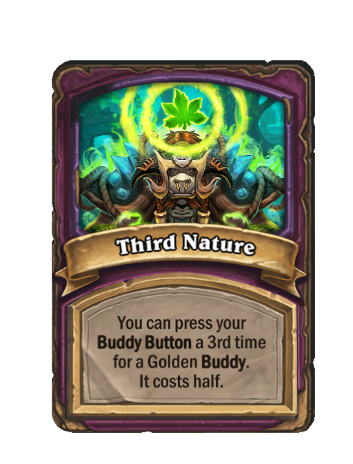 Third Nature is a Anomaly in Hearthstone Battlegrounds. Effect: You can press your Buddy Button a 3rd time for a Golden Buddy. It costs half. This card is no longer in the pool (Legacy).