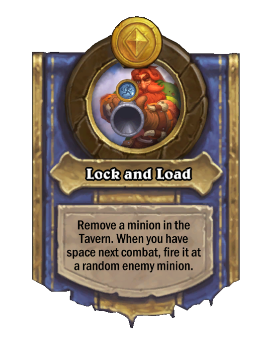 Lock and Load is a Hero Power in Hearthstone Battlegrounds. Effect: Remove a minion in the Tavern. When you have space next combat, fire it at a random enemy minion. Created by: Tavish Stormpike.