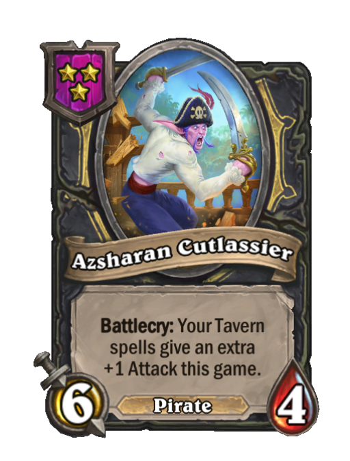 Azsharan Cutlassier is a Tier 3 Pirate Minion in Hearthstone Battlegrounds with 6/4 stats featuring Battlecry. Effect: Battlecry: Your Tavern spells give an extra +1 Attack this game. This card is no longer in the pool (Legacy).