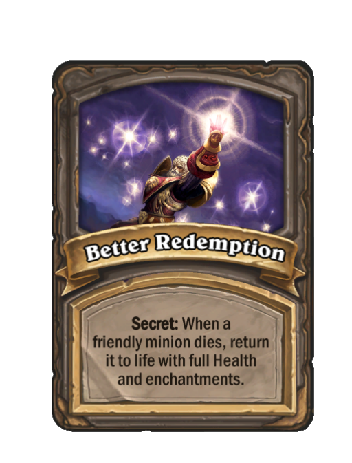 Better Redemption is a Spell in Hearthstone Battlegrounds featuring Secret. Effect: Secret: When a friendly minion dies, return it to life with full Health and enchantments.