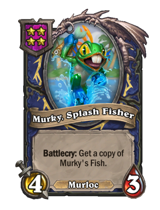 Murky, Splash Fisher is a Tier 4 Murloc Minion in Hearthstone Battlegrounds with 4/3 stats featuring Battlecry. Effect: Battlecry: Get a copy of Murky's Fish. This card is no longer in the pool (Legacy).