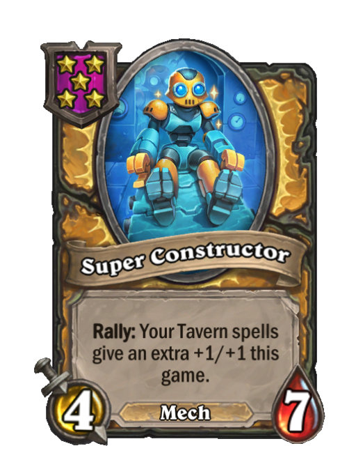 Super Constructor is a Tier 5 Mech Minion in Hearthstone Battlegrounds with 4/7 stats featuring Rally. Effect: Rally: Your Tavern spells give an extra +1/+1 this game. This card is no longer in the pool (Legacy).
