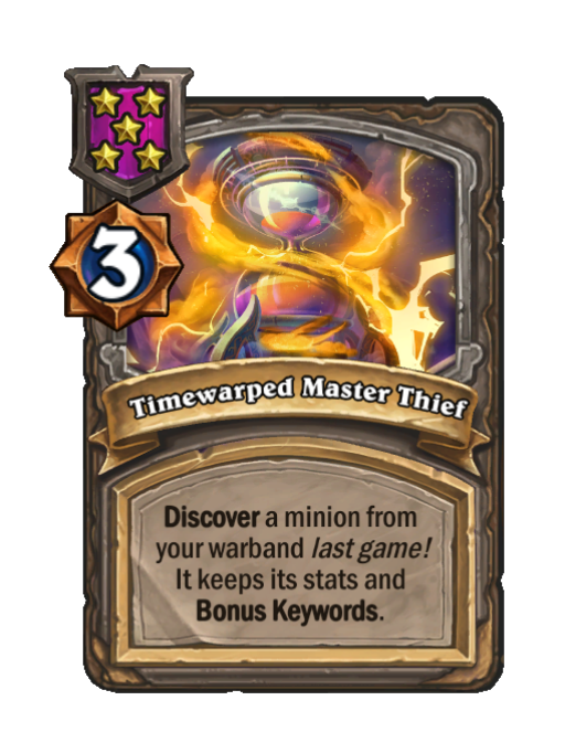 Timewarped Master Thief is a Tier 5 Spell in Hearthstone Battlegrounds featuring Discover (Timewarped). Effect: Discover a minion from your warband last game! It keeps its stats and Bonus Keywords. Costs 3 Gold. This card is no longer in the pool (Legacy).