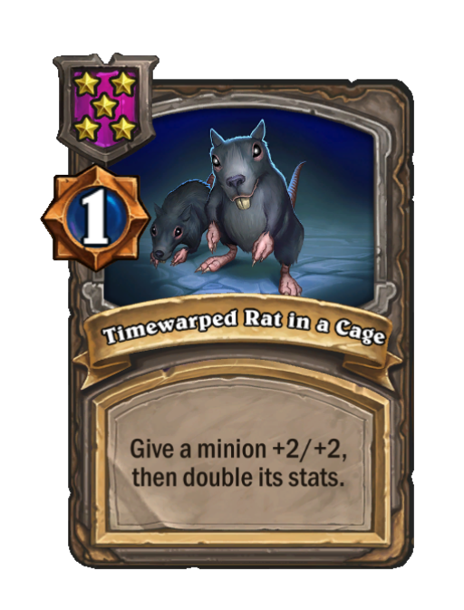Timewarped Rat in a Cage is a Tier 5 Spell in Hearthstone Battlegrounds (Timewarped). Effect: Give a minion +2/+2, then double its stats. Costs 1 Gold.