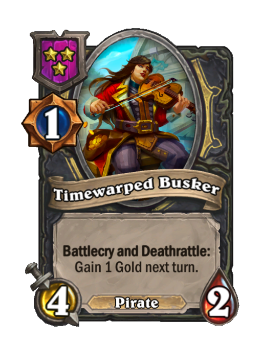 Timewarped Busker is a Tier 3 Pirate Minion in Hearthstone Battlegrounds with 4/2 stats featuring Deathrattle, Battlecry. Effect: Battlecry and Deathrattle: Gain 1 Gold next turn.