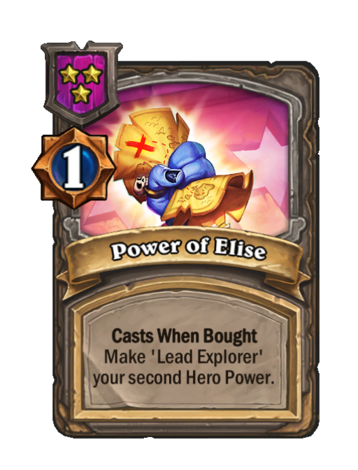 Power of Elise is a Tier 3 Spell in Hearthstone Battlegrounds (Timewarped). Effect: Casts When Bought Make 'Lead Explorer' your second Hero Power. Costs 1 Gold.