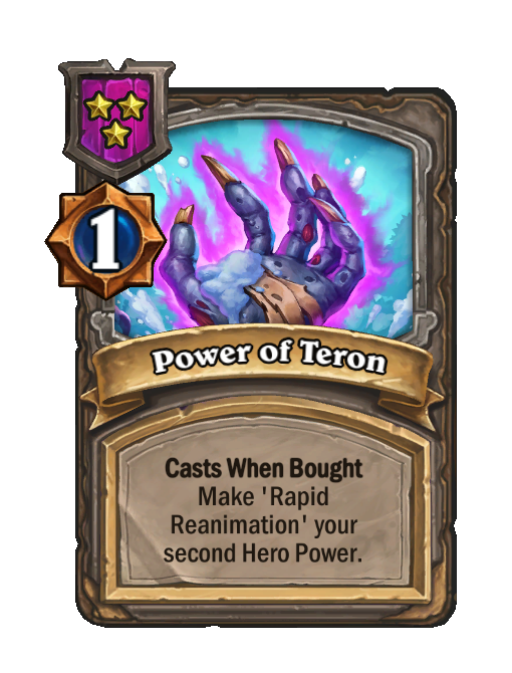 Power of Teron is a Tier 3 Spell in Hearthstone Battlegrounds (Timewarped). Effect: Casts When Bought Make 'Rapid Reanimation' your second Hero Power. Costs 1 Gold.