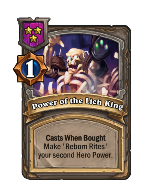 Power of the Lich King is a Tier 3 Spell in Hearthstone Battlegrounds (Timewarped). Effect: Casts When Bought Make 'Reborn Rites' your second Hero Power. Costs 1 Gold.