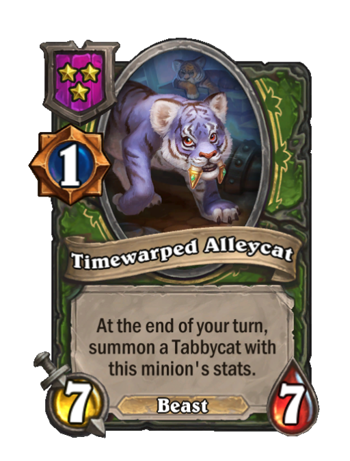 Timewarped Alleycat is a Tier 3 Beast Minion in Hearthstone Battlegrounds with 7/7 stats featuring End of Turn. Effect: At the end of your turn, summon a Tabbycat with this minion's stats.