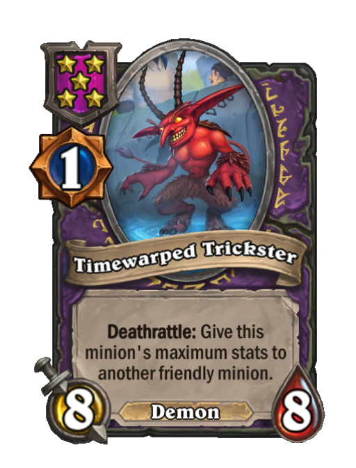 Timewarped Trickster is a Tier 5 Demon Minion in Hearthstone Battlegrounds with 8/8 stats featuring Deathrattle. Effect: Deathrattle: Give this minion's maximum stats to another friendly minion. This card is no longer in the pool (Legacy).