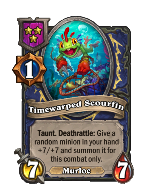 Timewarped Scourfin is a Tier 3 Murloc Minion in Hearthstone Battlegrounds with 7/7 stats featuring Taunt, Deathrattle. Effect: Taunt. Deathrattle: Give a random minion in your hand +7/+7 and summon it for this combat only.