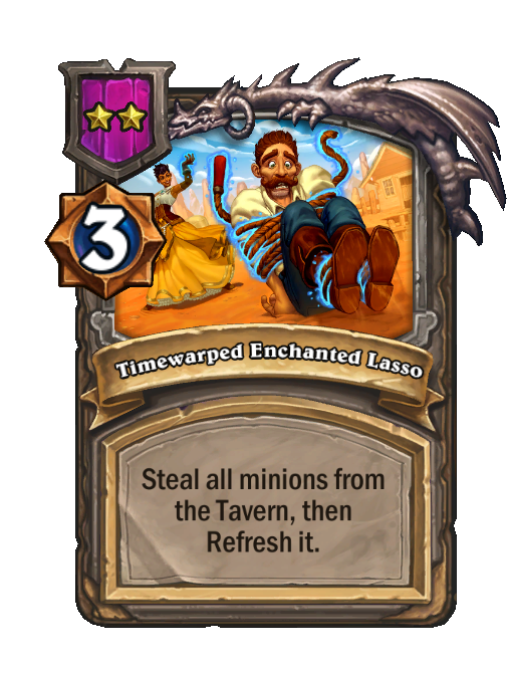 Timewarped Enchanted Lasso is a Tier 2 Spell in Hearthstone Battlegrounds (Timewarped). Effect: Steal all minions from the Tavern, then Refresh it. Costs 3 Gold. This card is no longer in the pool (Legacy).