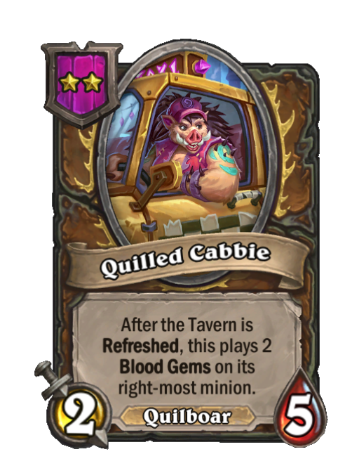 Quilled Cabbie is a Tier 2 Quilboar Minion in Hearthstone Battlegrounds with 2/5 stats. Effect: After the Tavern is Refreshed, this plays 2 Blood Gems on its right-most minion. This card is no longer in the pool (Legacy).