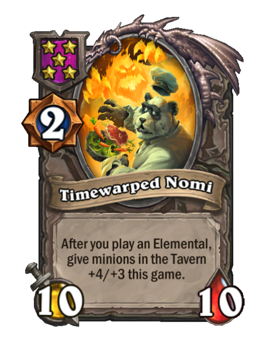 Timewarped Nomi is a Tier 5 Minion in Hearthstone Battlegrounds with 10/10 stats. Effect: After you play an Elemental, give minions in the Tavern +4/+3 this game.