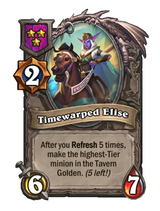 Timewarped Elise is a Tier 3 Minion in Hearthstone Battlegrounds with 6/7 stats. Effect: After you Refresh 5 times, make the highest-Tier minion in the Tavern Golden. (5 left!).