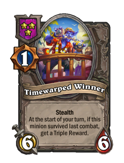 Timewarped Winner is a Tier 3 Minion in Hearthstone Battlegrounds with 6/6 stats featuring Stealth, Start of Turn. Effect: Stealth At the start of your turn, if this minion survived last combat, get a Triple Reward.