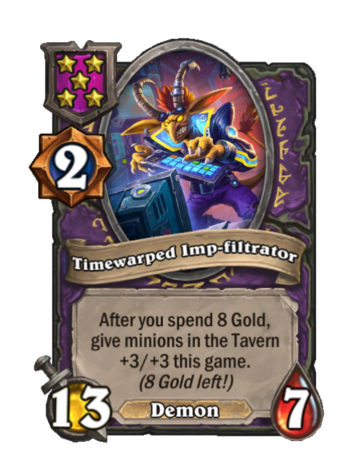 Timewarped Imp-filtrator is a Tier 5 Demon Minion in Hearthstone Battlegrounds with 13/7 stats. Effect: After you spend 8 Gold, give minions in the Tavern +3/+3 this game. (8 Gold left!).