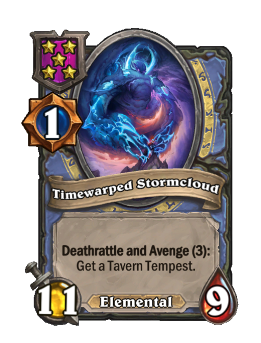 Timewarped Stormcloud is a Tier 5 Elemental Minion in Hearthstone Battlegrounds with 11/9 stats featuring Deathrattle, Avenge. Effect: Deathrattle and Avenge (3): Get a Tavern Tempest.