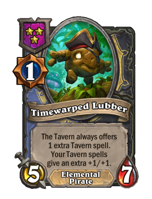 Timewarped Lubber is a Tier 3 Elemental/Pirate Minion in Hearthstone Battlegrounds with 5/7 stats featuring Aura. Effect: The Tavern always offers 1 extra Tavern spell. Your Tavern spells give an extra +1/+1.