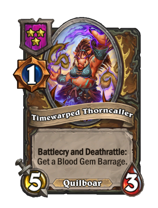 Timewarped Thorncaller is a Tier 3 Quilboar Minion in Hearthstone Battlegrounds with 5/3 stats featuring Deathrattle, Battlecry. Effect: Battlecry and Deathrattle: Get a Blood Gem Barrage.