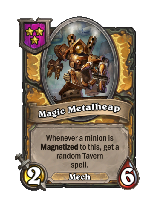Magic Metalheap is a Tier 3 Mech Minion in Hearthstone Battlegrounds with 2/6 stats. Effect: Whenever a minion is Magnetized to this, get a random Tavern spell. This card is no longer in the pool (Legacy).