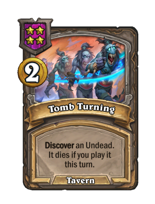 Tomb Turning is a Tier 4 Spell in Hearthstone Battlegrounds featuring Discover (Tavern). Effect: Discover an Undead. It dies if you play it this turn. Costs 2 Gold.