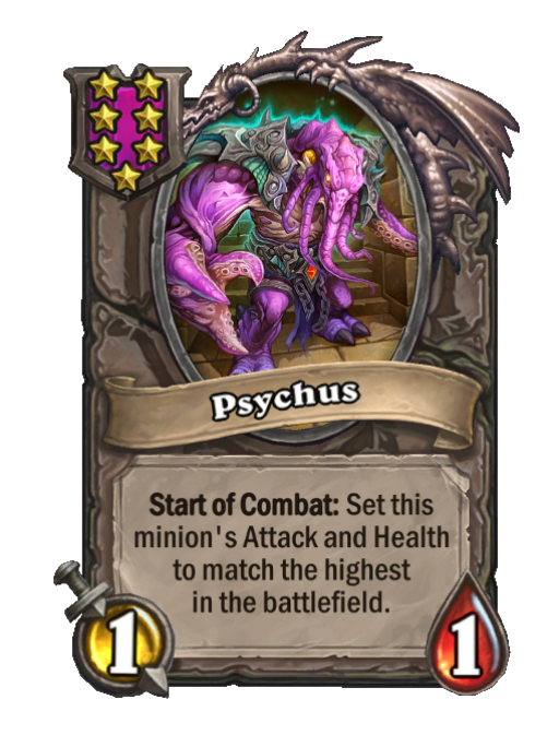 Psychus is a Tier 7 Minion in Hearthstone Battlegrounds with 1/1 stats featuring Start of Combat. Effect: Start of Combat: Set this minion's Attack and Health to match the highest in the battlefield. This card is no longer in the pool (Legacy).